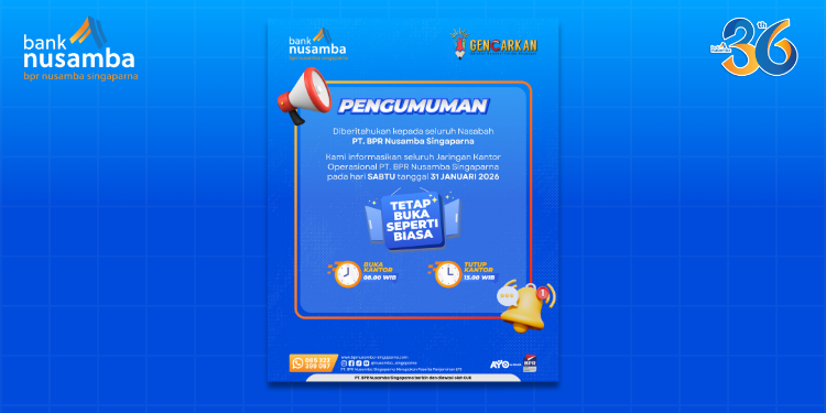 Diberitahukan kepada seluruh Nasabah PT. BPR Nusamba Singaparna, kami informasikan seluruh Jaringan Kantor Operasional PT. BPR Nusamba Singaparna pada: